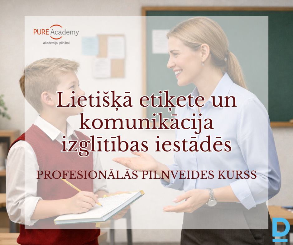 Vai vēlies justies pārliecināti jebkurā profesionālā situācijā – gan klasē, gan vecāku sapulcē, gan e-pastu un Zoom sarunās? Vai zini, kā lietišķā etiķete, apģērba kultūra un pārdomāta komunikācija var stiprināt Tavu autoritāti un profesionālo tēlu izglītības iestādē? Vai gribi apgūt praktiskas prasmes – no netiķetes un e-pastu lietošanas līdz prezentāciju veidošanai, telefona sarunu kultūrai un dāvināšanas etiķetei? ? Ja atbilde ir ”jā!”, tad pievienojies pedagogu profesionālās kompetences pilnveides programmai ”Lietišķā etiķete un komunikācija izglītības iestādēs” – SĀKAM 5. MARTĀ! ? 5., 10. un 19. martā (plkst. 18.00-20.50) ? Attālināti Zoom platformā ? 16 akadēmiskās stundas ? Noslēgumā – apliecība atbilstoši MK noteikumiem Nodarbību vadītāja: Inga Pūre, komunikācijas zinātņu doktore, lietišķās etiķetes un sabiedrisko attiecību eksperte, uzņēmēja. ❗ Programmas mērķgrupa: pedagogi, kā arī ikviens interesents, kas vēlas paaugstināt savas zināšanas par lietišķo etiķeti un komunikāciju. Noderīgi ikvienam! ? Dalības maksa: 58,00 EUR Noslēgumā dalībniekiem tiks izsniegta pedagogu profesionālās kompetences pilnveides apliecība, atbilstošas MK noteikumiem Nr. 569 (11.09.2019.) ?Saite ar papildus informāciju un uz pieteikšanos: pureacademy.lv-pilnveide-pedagogu profesionālās kompetences pilnveide Papildus jautājumu gadījumā, droši, sazinies ar mums: Tālr. 26354505; e-pasts: info@pureacademy.lv |